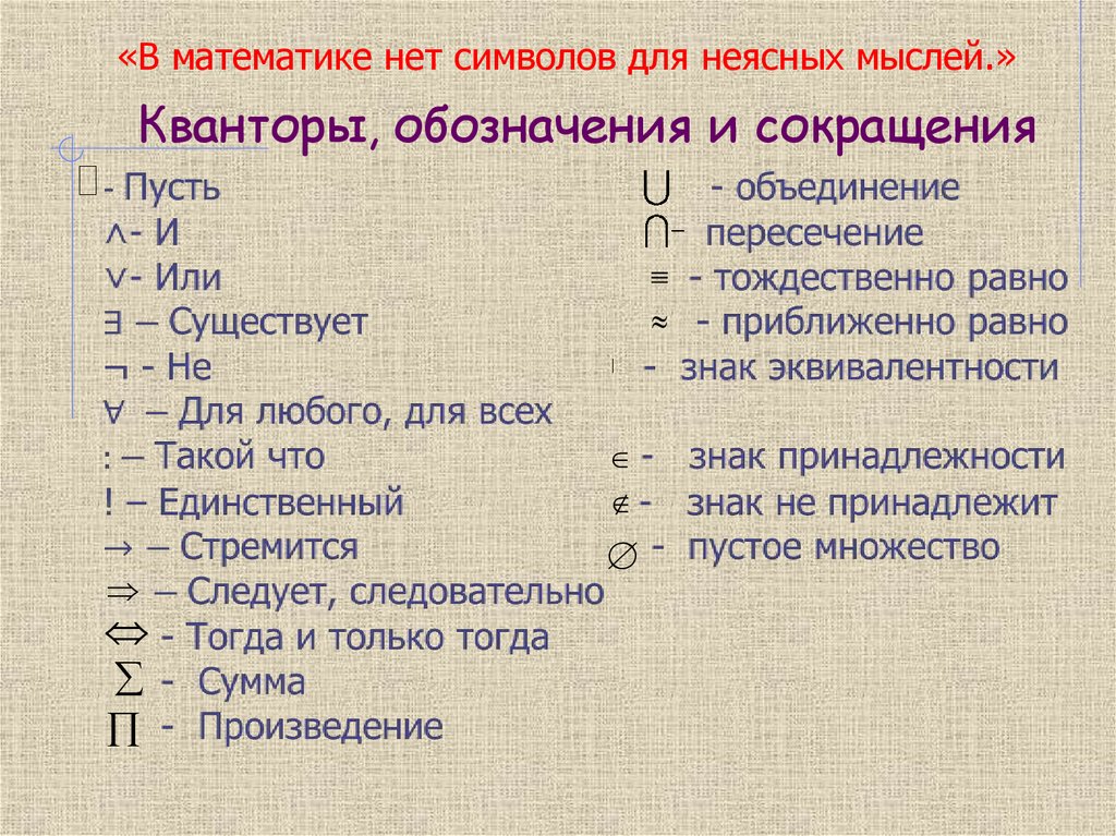 «В математике нет символов для неясных мыслей.»Кванторы, обозначения и сокращения