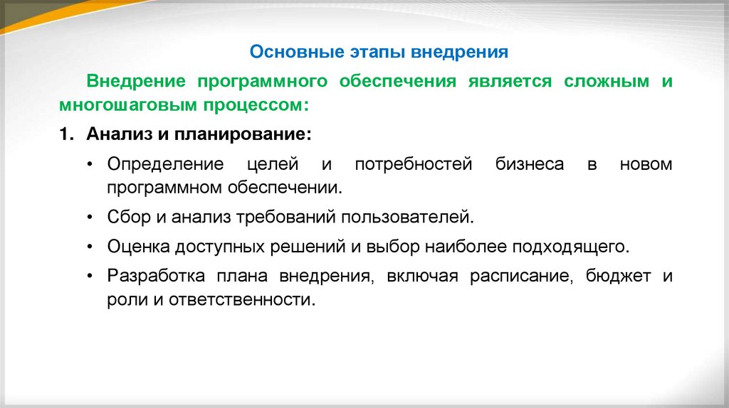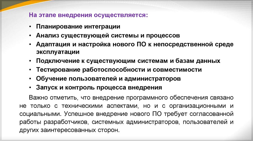 6. Какие основные этапы внедрения проходит ПО и какие факторы