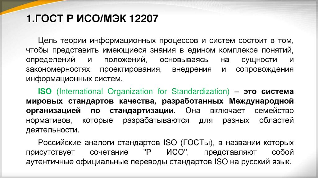 1.ГОСТ Р ИСО/МЭК 12207Цель теории информационных процессов и систем состоит в том,
