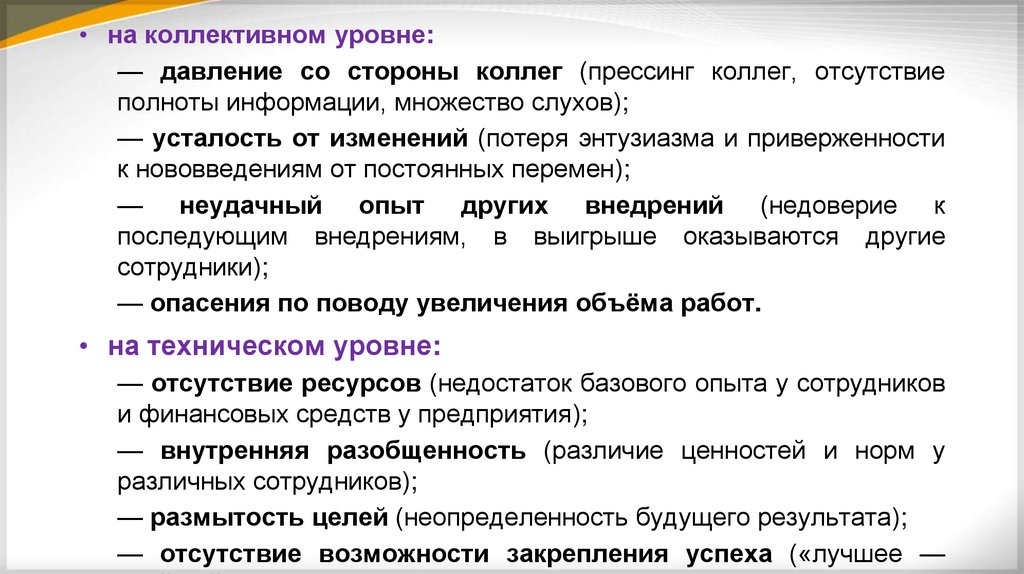 • на коллективном уровне:— давление со стороны коллег (прессинг коллег, отсутствие