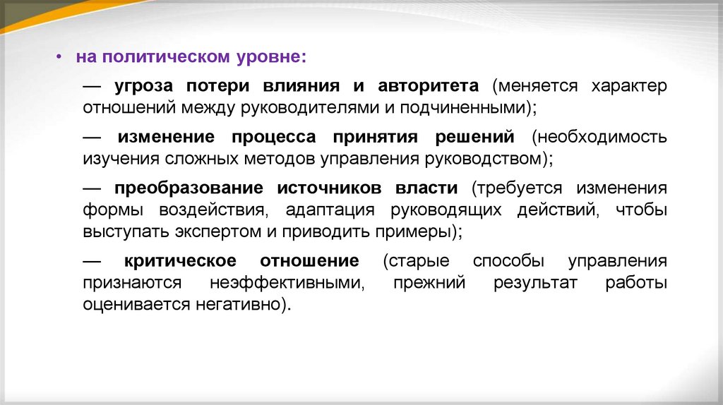 • на политическом уровне:— угроза потери влияния и авторитета (меняется характер