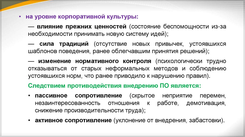 • на уровне корпоративной культуры:— влияние прежних ценностей (состояние беспомощности из-за