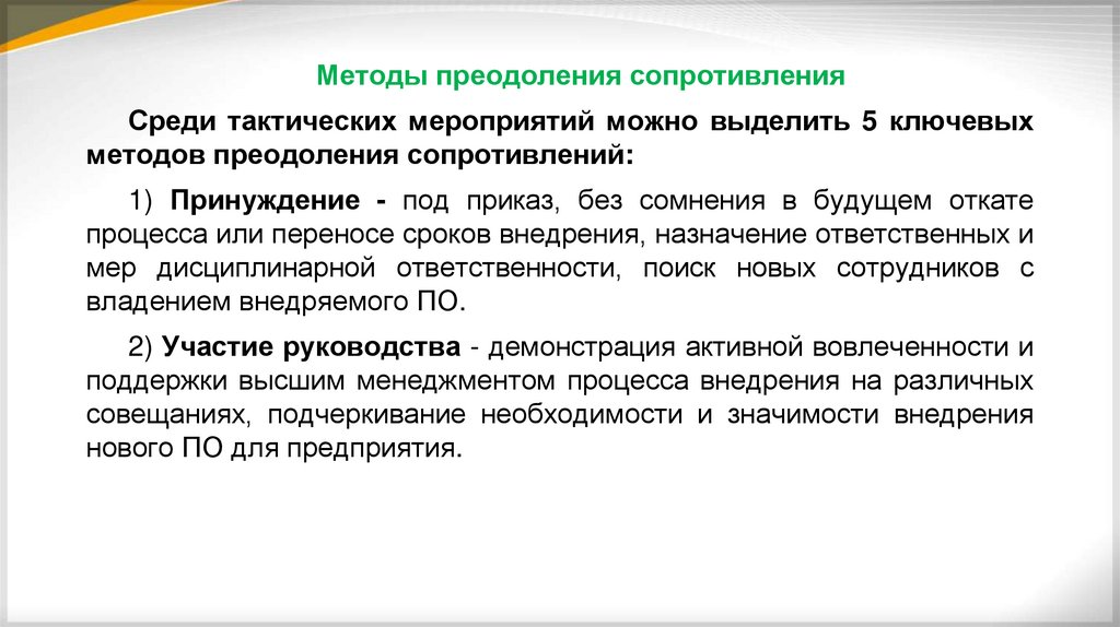 Методы преодоления сопротивленияСреди тактических мероприятий можно выделить 5 ключевых