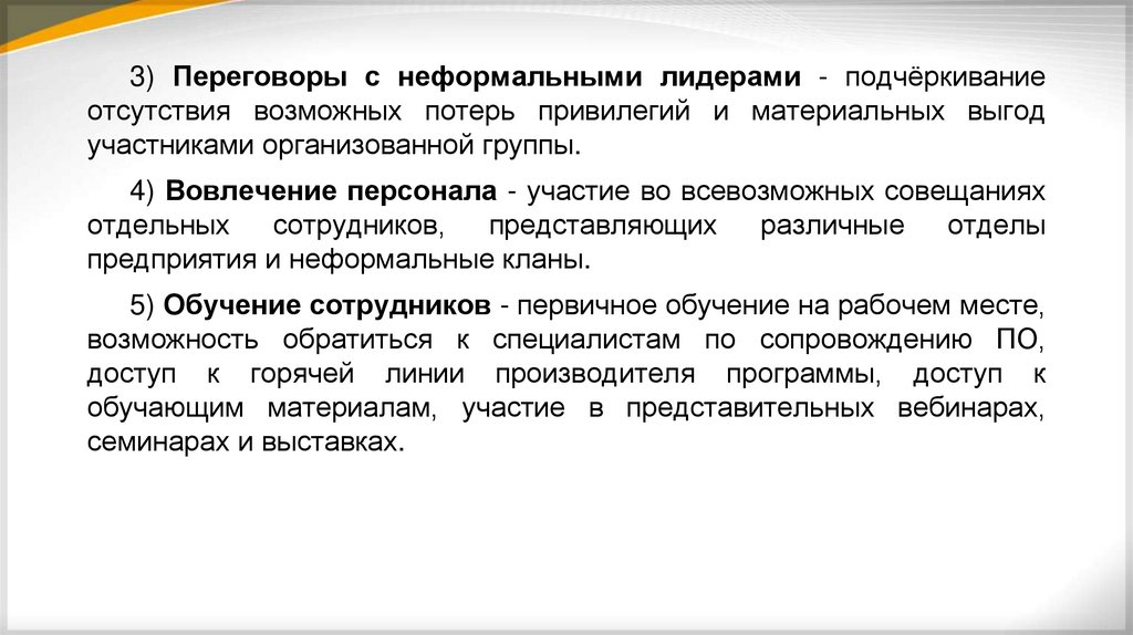 3) Переговоры с неформальными лидерами - подчёркиваниеотсутствия возможных потерь привилегий и материальных выгод