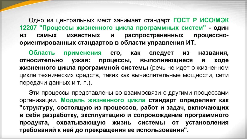 Одно из центральных мест занимает стандарт ГОСТ Р ИСО/МЭК12207 "Процессы жизненного цикла программных систем" - один