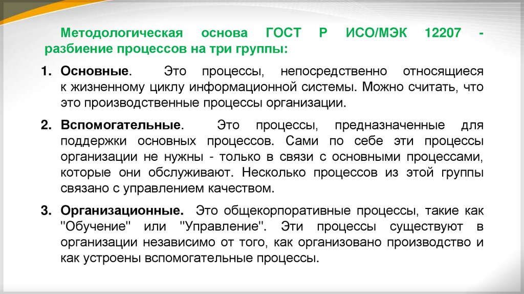 Методологическая основа ГОСТразбиение процессов на три группы: