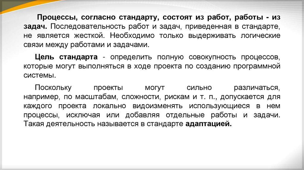 Процессы, согласно стандарту, состоят из работ, работы - иззадач. Последовательность работ и задач, приведенная в стандарте,