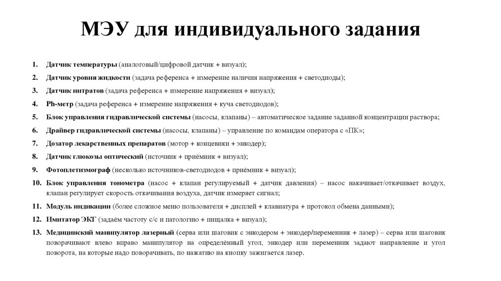 Медицинские электронные устройства: исполнительные устройства, датчики обратной связи,интерфейсы как отдельные электронные модули (не ПО)