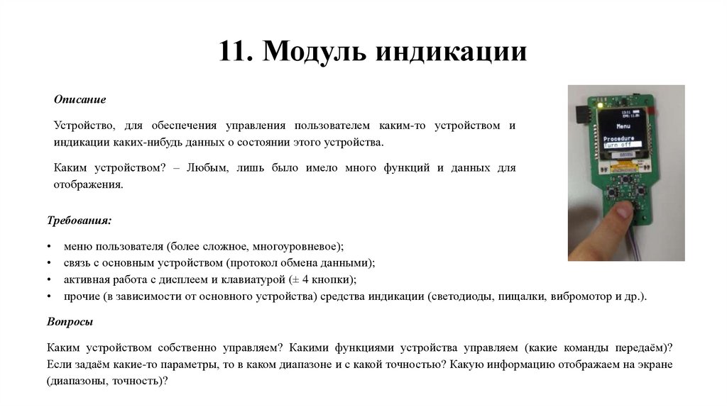 прочие (в зависимости от основного устройства) средства индикации (светодиоды, пищалки, вибромотор и др.).