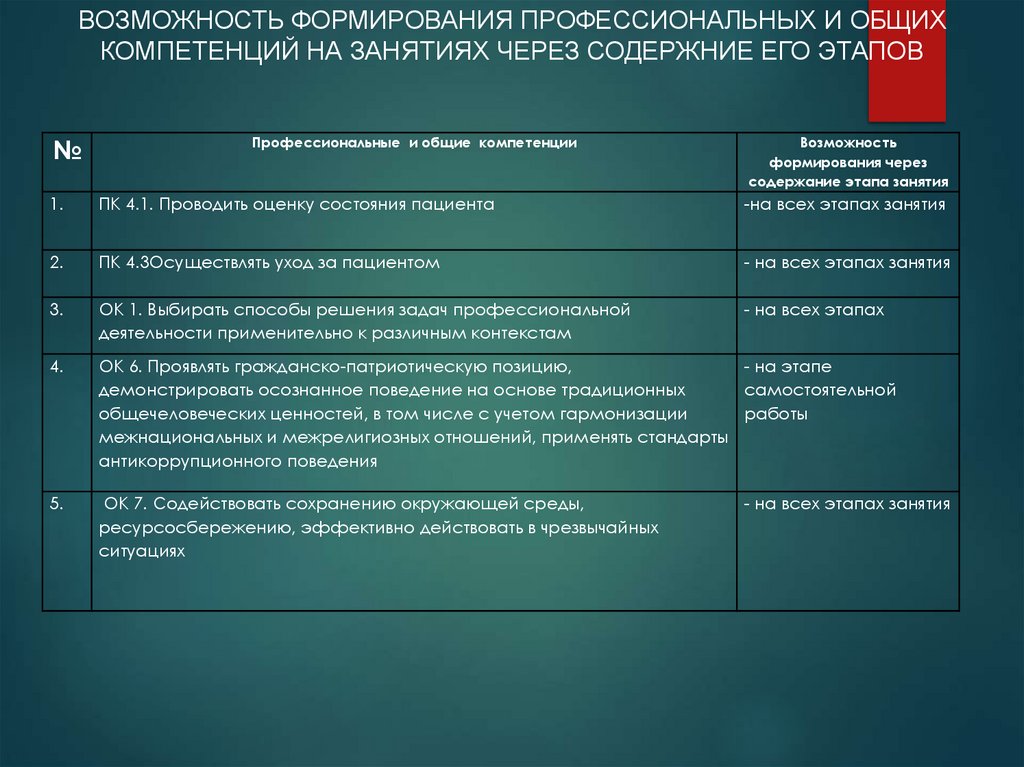 ВОЗМОЖНОСТЬ ФОРМИРОВАНИЯ ПРОФЕССИОНАЛЬНЫХ И ОБЩИХКОМПЕТЕНЦИЙ НА ЗАНЯТИЯХ ЧЕРЕЗ СОДЕРЖНИЕ ЕГО ЭТАПОВ