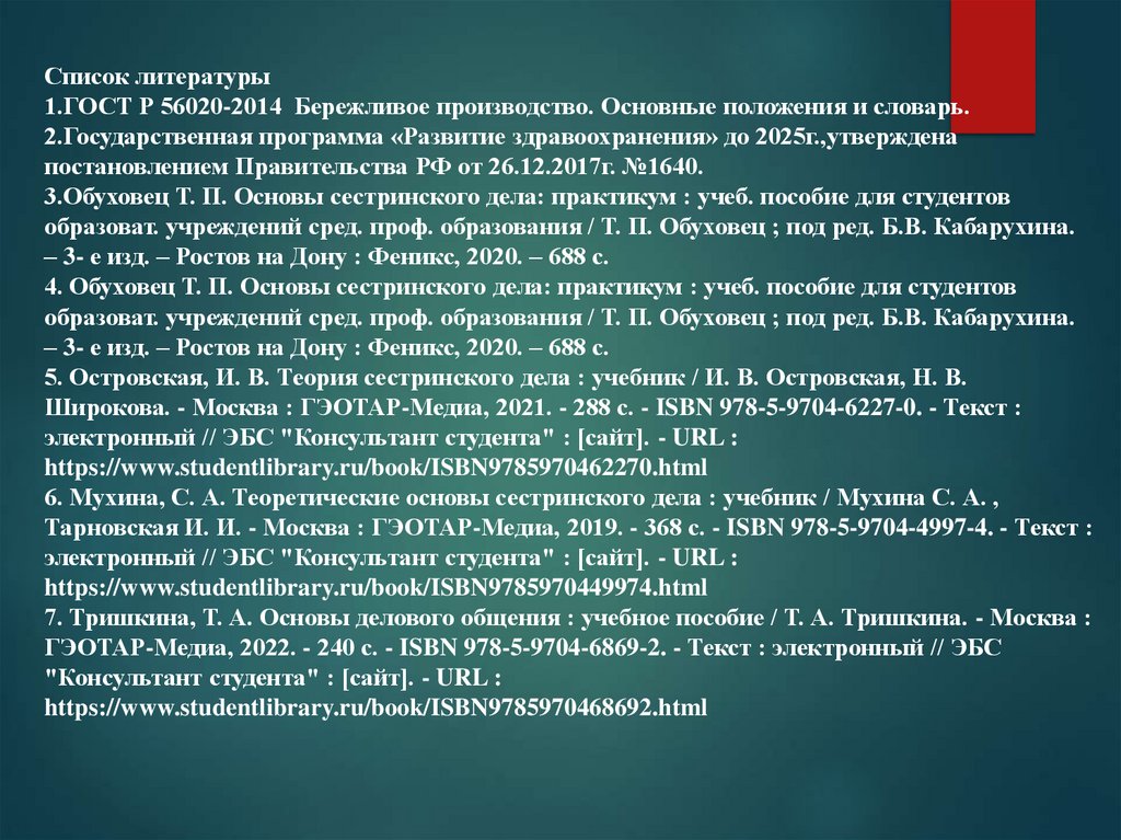 Список литературы1.ГОСТ Р 56020-2014 Бережливое производство. Основные положения и словарь.