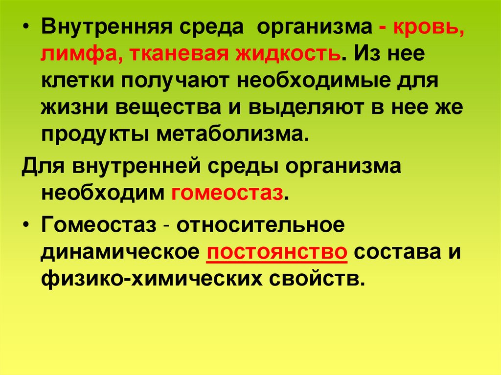 • Внутренняя среда организма - кровь,лимфа, тканевая жидкость. Из нее