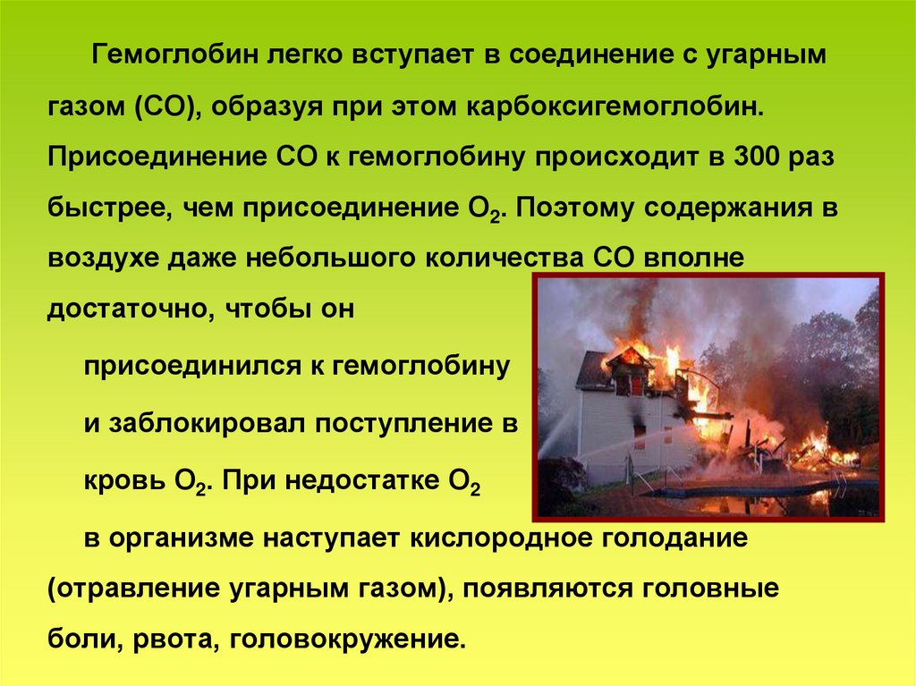 Гемоглобин легко вступает в соединение с угарнымгазом (СО), образуя при этом карбоксигемоглобин.