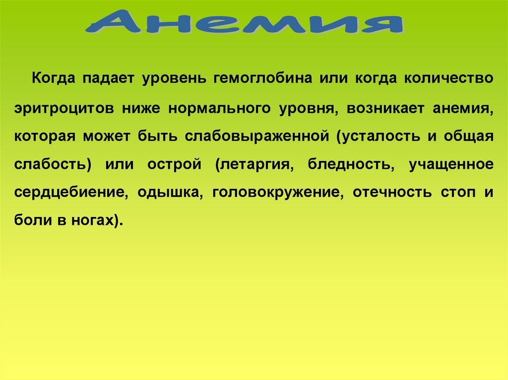 Когда падает уровень гемоглобина или когда количествоэритроцитов ниже нормального уровня, возникает анемия,