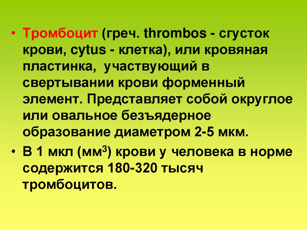 • Тромбоцит (греч. thrombos - сгустоккрови, cytus - клетка), или кровяная