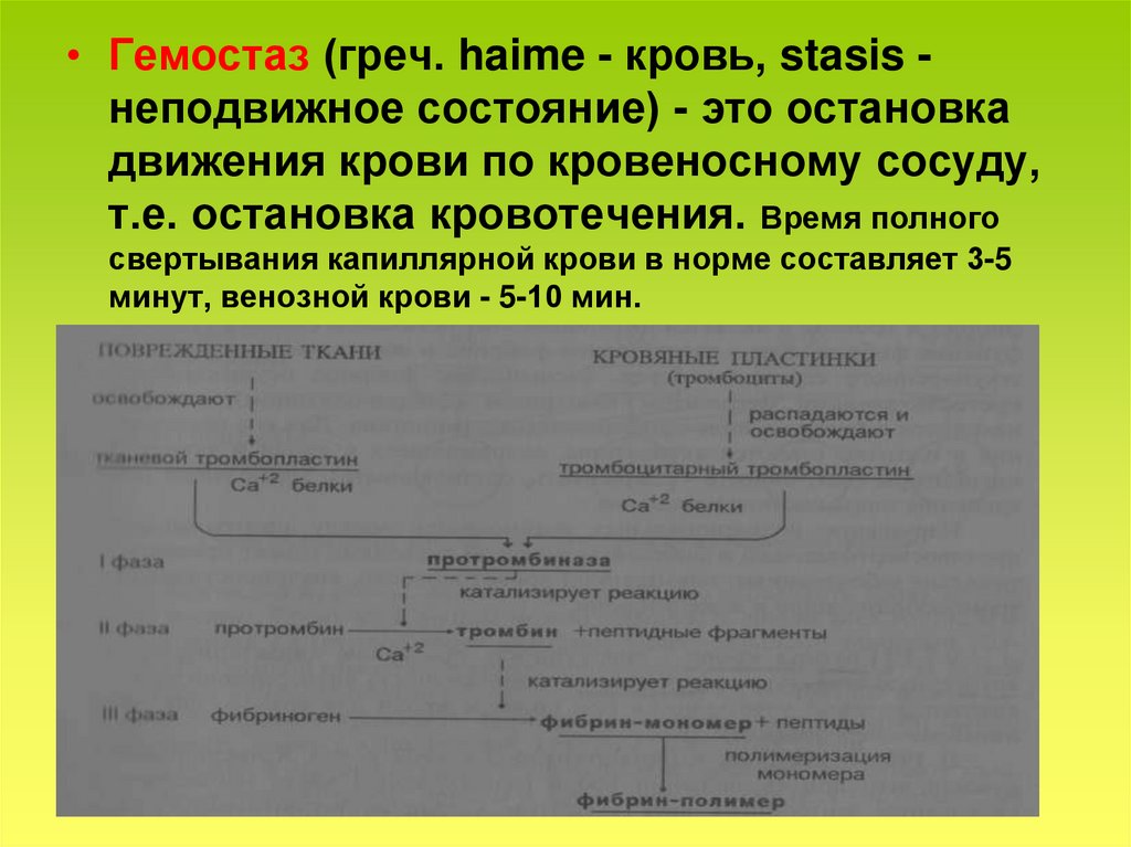• Гемостаз (греч. haime - кровь, stasis неподвижное состояние) - это остановкадвижения крови по кровеносному сосуду,