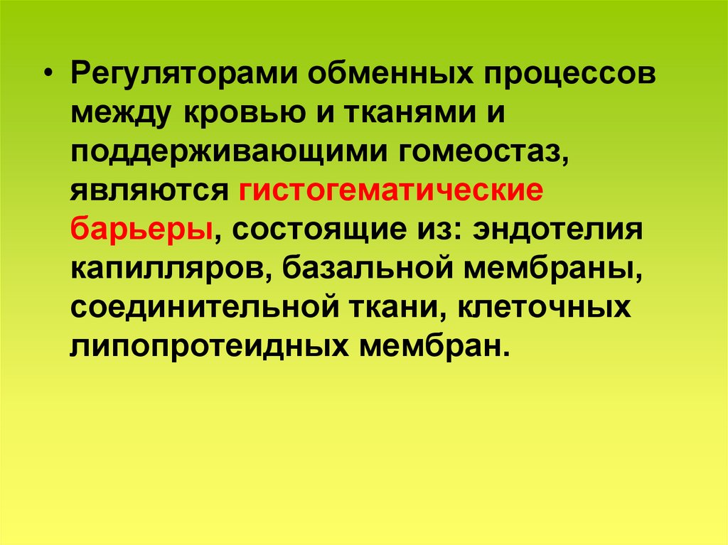 • Регуляторами обменных процессовмежду кровью и тканями и