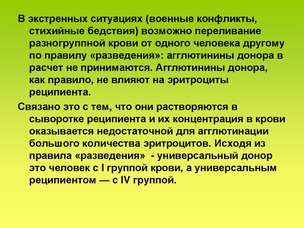 В экстренных ситуациях (военные конфликты,стихийные бедствия) возможно переливание