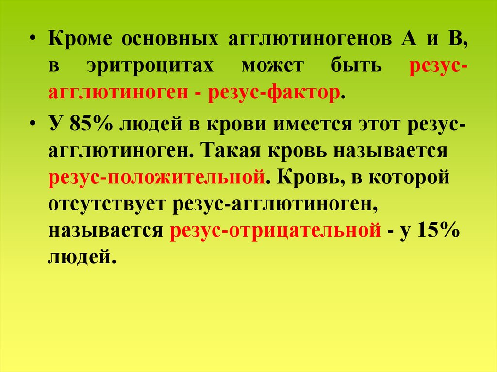 • У 85% людей в крови имеется этот резусагглютиноген. Такая кровь называется