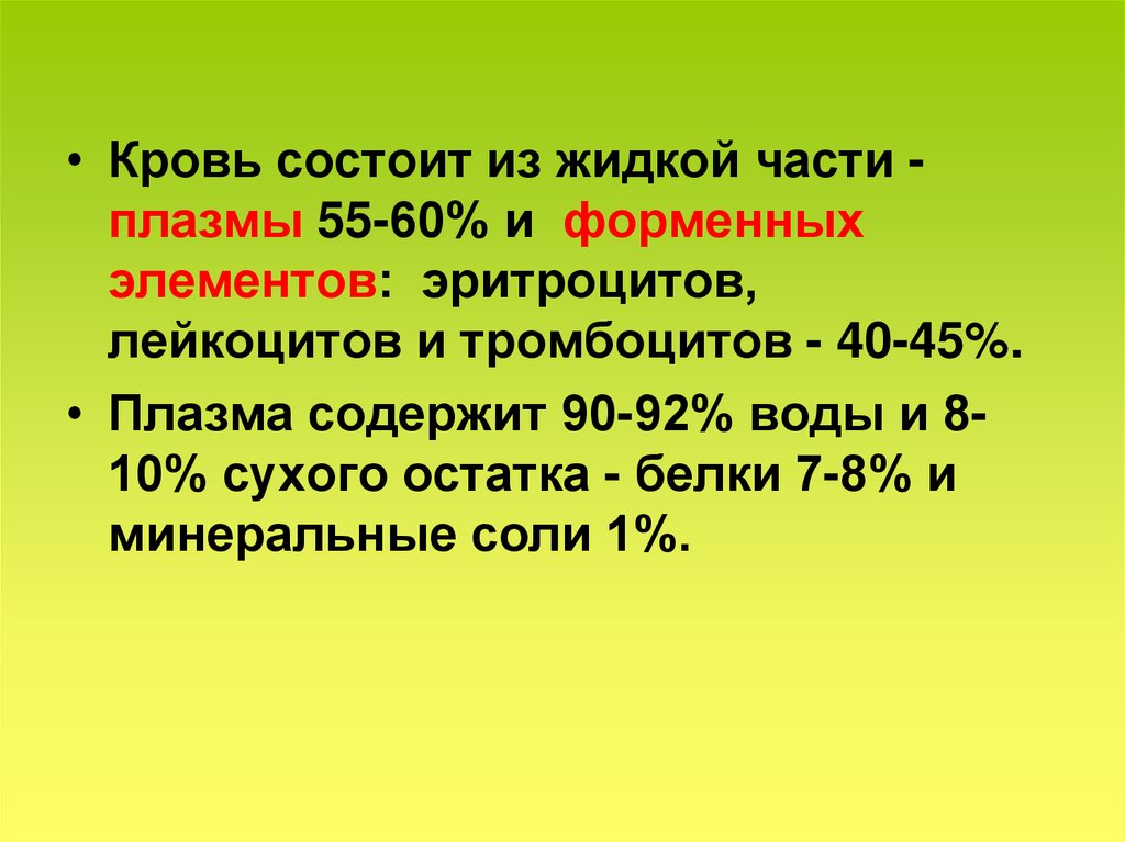 • Кровь состоит из жидкой части плазмы 55-60% и форменныхэлементов: эритроцитов,