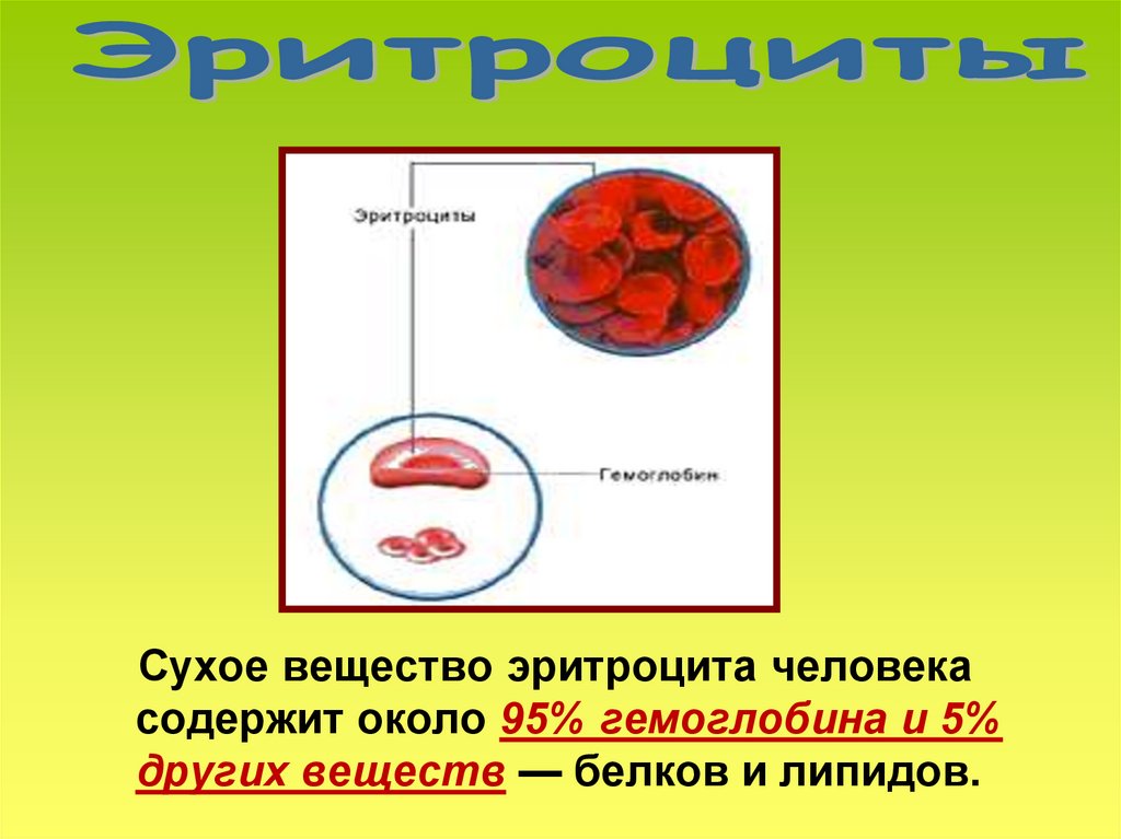 Сухое вещество эритроцита человекасодержит около 95% гемоглобина и 5%