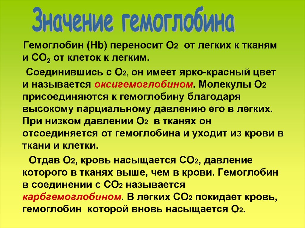 Гемоглобин (Hb) переносит О2 от легких к тканями СО2 от клеток к легким.