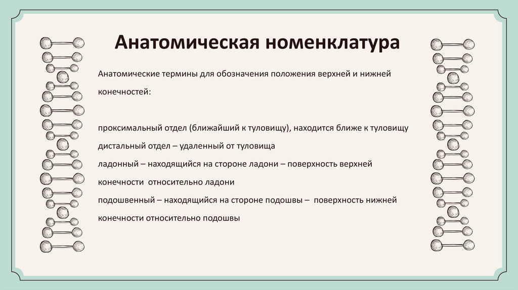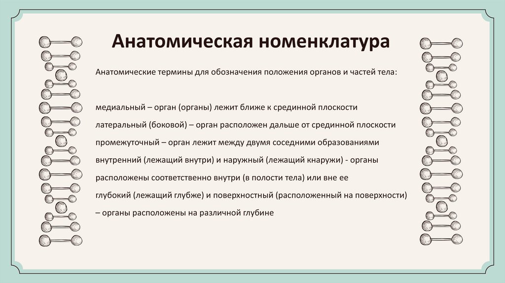 Анатомическая номенклатураАнатомические термины для обозначения положения органов и частей тела: