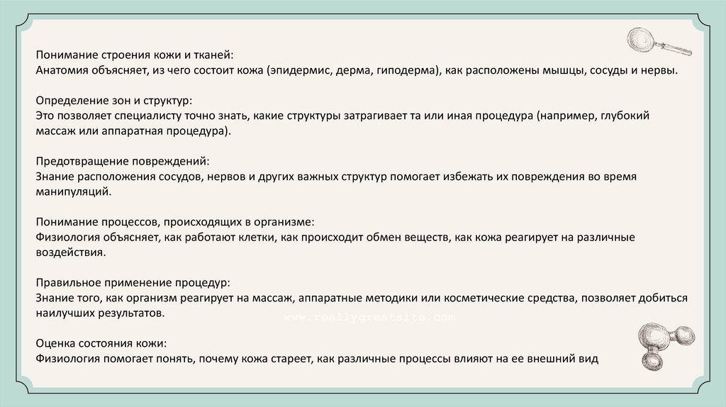 Понимание строения кожи и тканей:Анатомия объясняет, из чего состоит кожа (эпидермис, дерма, гиподерма), как расположены мышцы, сосуды и нервы.
