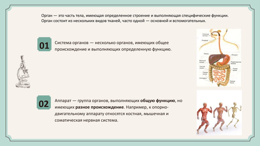 Орган — это часть тела, имеющая определенное строение и выполняющая специфические функции.Орган состоит из нескольких видов тканей, часто одной — основной и вспомогательных.