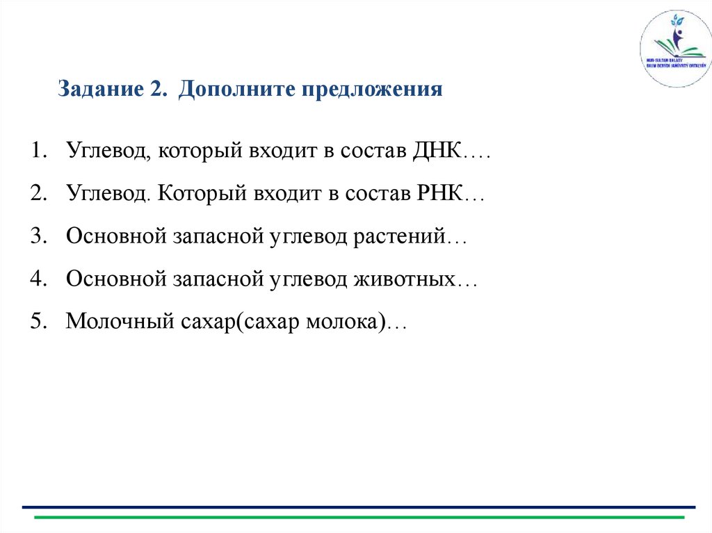 Задание 2. Дополните предложения1. Углевод, который входит в состав ДНК….