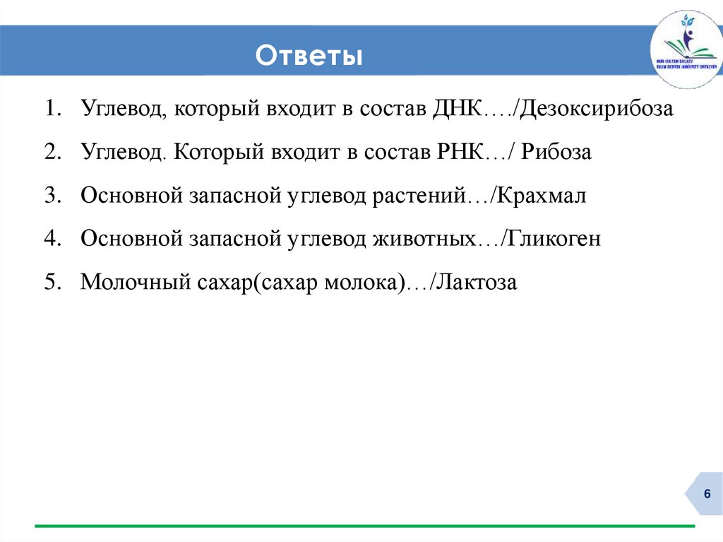 Ответы1. Углевод, который входит в состав ДНК…./Дезоксирибоза