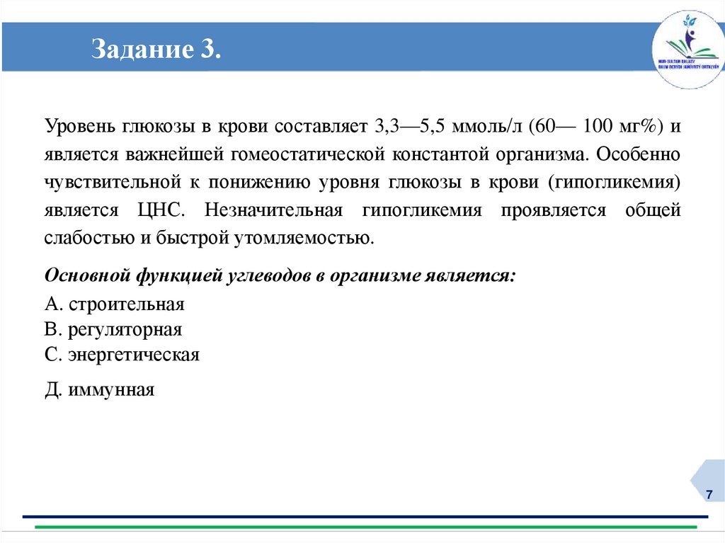Задание 3.Уровень глюкозы в крови составляет 3,3—5,5 ммоль/л (60— 100 мг%) и