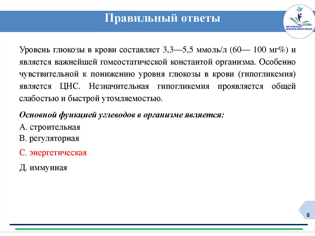 Правильный ответыУровень глюкозы в крови составляет 3,3—5,5 ммоль/л (60— 100 мг%) и