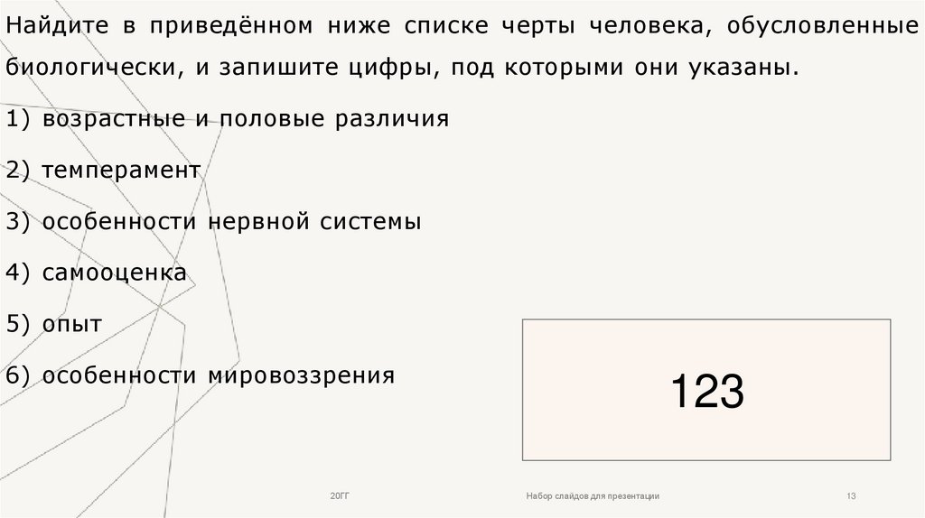 Найдите в приведённом ниже списке черты человека, обусловленныебиологически, и запишите цифры, под которыми они указаны.