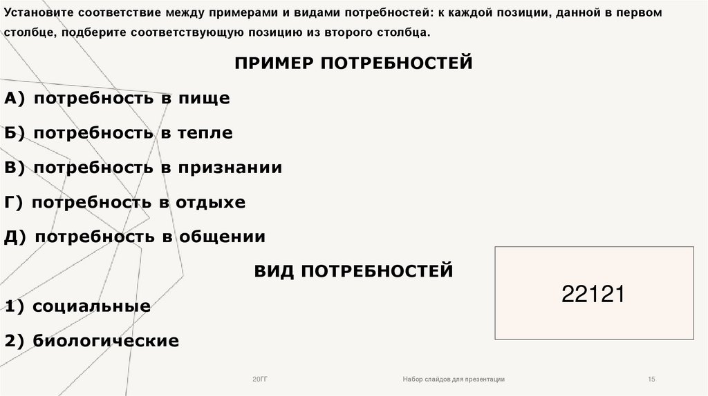 Установите соответствие между примерами и видами потребностей: к каждой позиции, данной в первомстолбце, подберите соответствующую позицию из второго столбца.