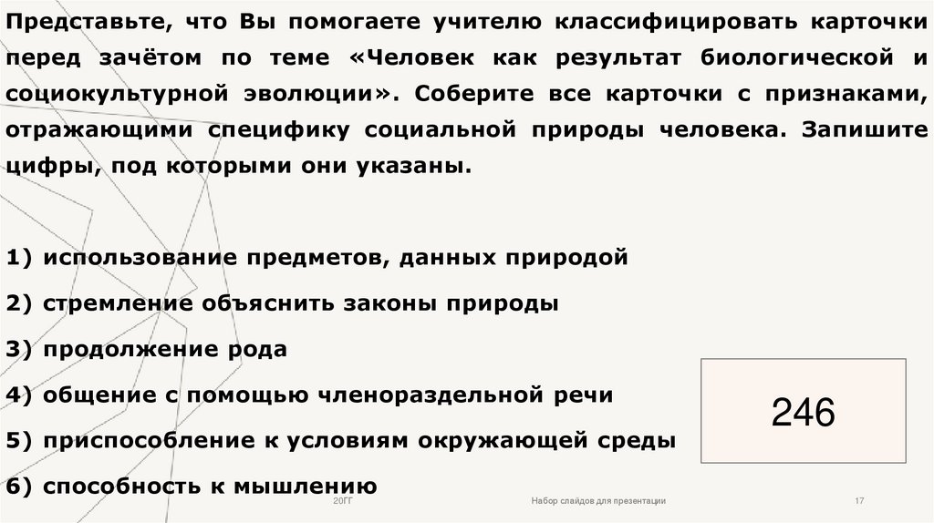 Представьте, что Вы помогаете учителю классифицировать карточкиперед зачётом по теме «Человек как результат биологической и