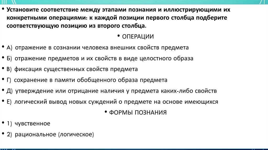 • Установите соответствие между этапами познания и иллюстрирующими ихконкретными операциями: к каждой позиции первого столбца подберите