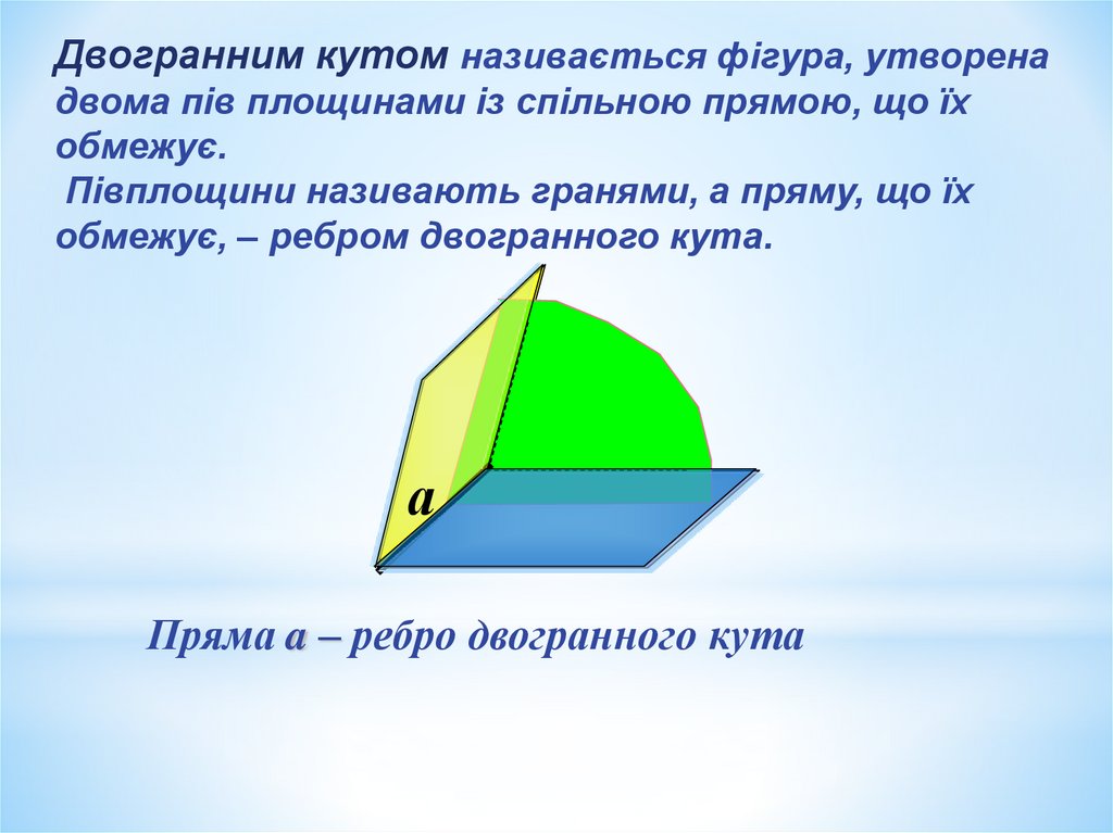 Двогранним кутом називається фігура, утворенадвома пів площинами із спільною прямою, що їх