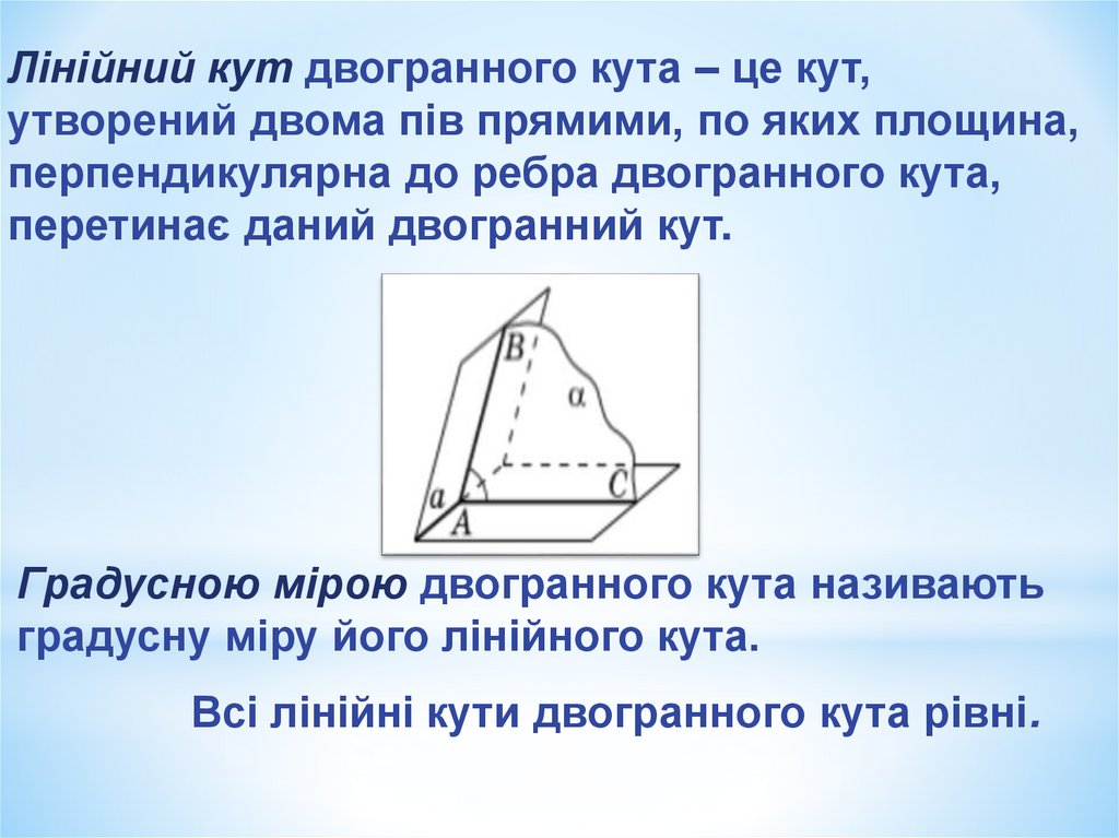 Лінійний кут двогранного кута – це кут,утворений двома пів прямими, по яких площина,