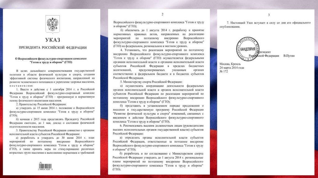 1. О Всероссийском физкультурно-спортивном комплексе «Готов ктруду и обороне» (ГТО) от 24.03.2014 № 172.