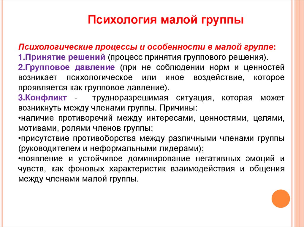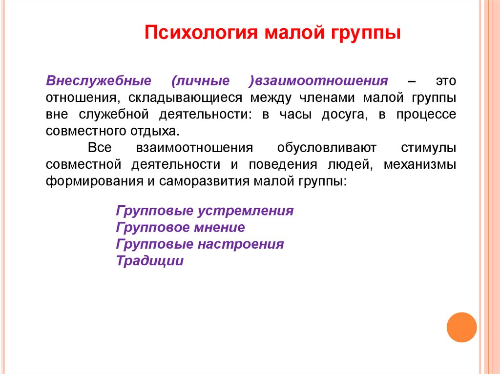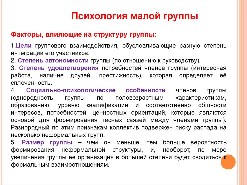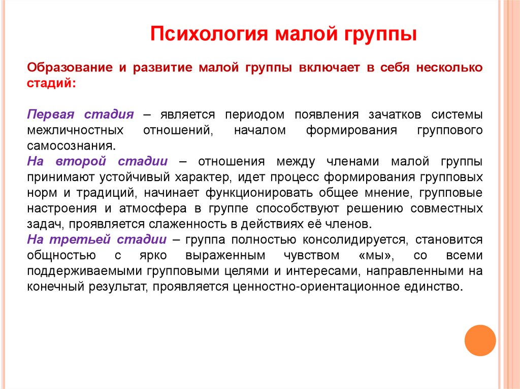 Психология малой группыОбразование и развитие малой группы включает в себя несколько