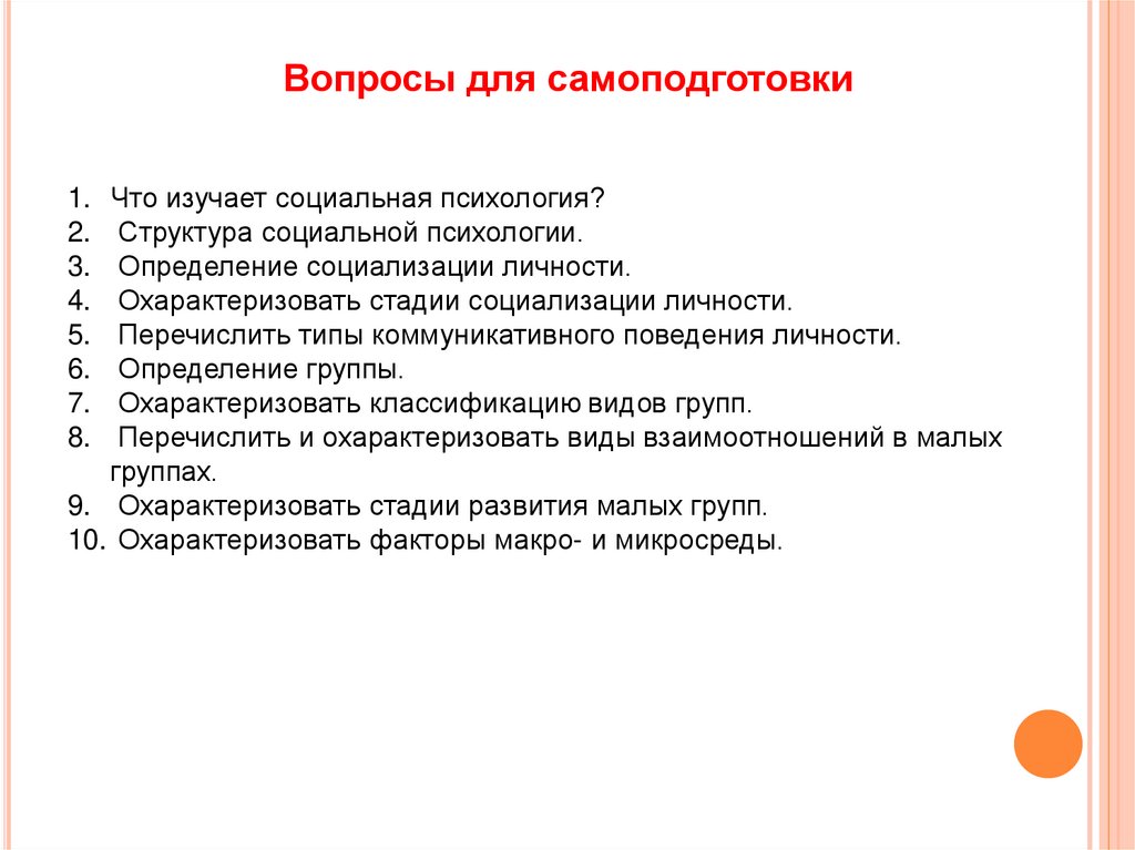 Вопросы для самоподготовки1. Что изучает социальная психология?