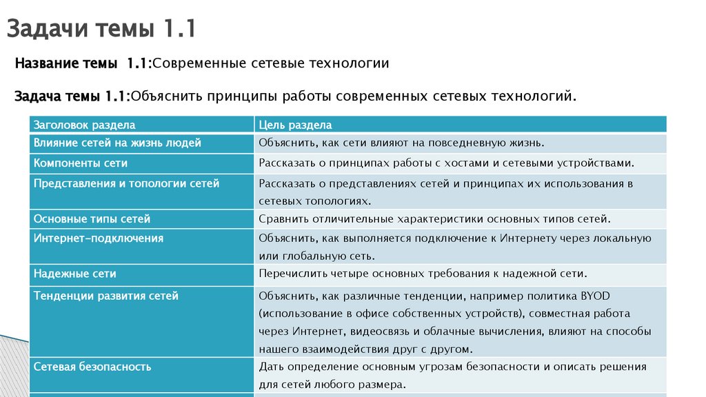 Задачи темы 1.1Название темы 1.1:Современные сетевые технологии