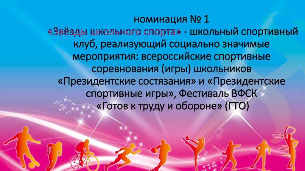 2. номинация № 1 «Звёзды школьного спорта» - школьный спортивный клуб, реализующий социально значимые мероприятия: всероссийские
