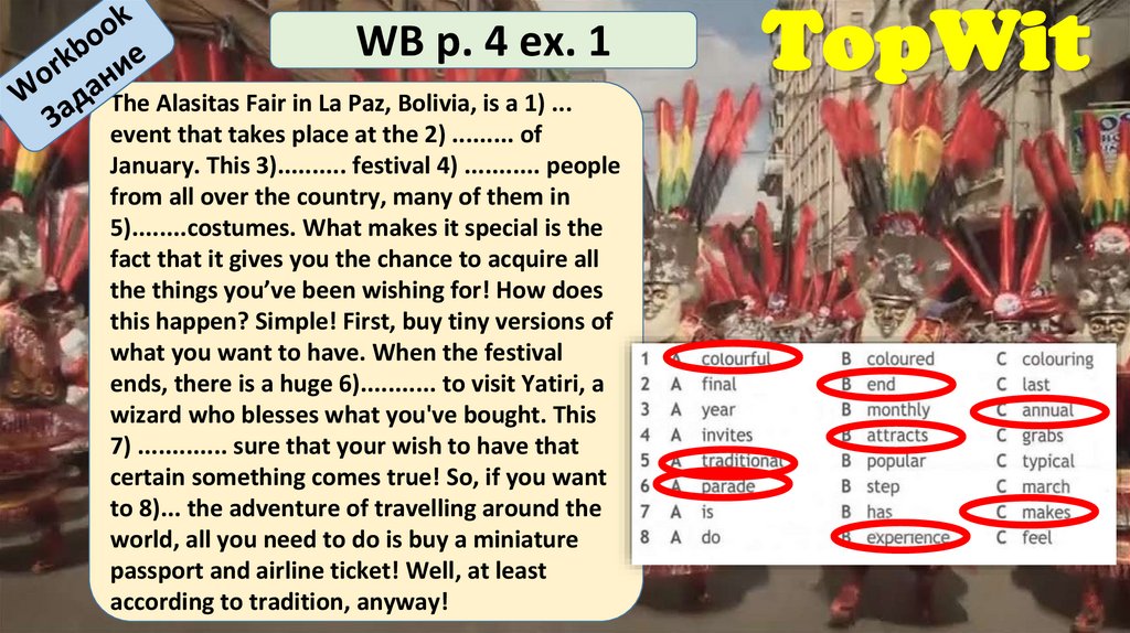 WB p. 4 ex. 1The Alasitas Fair in La Paz, Bolivia, is a 1) ...