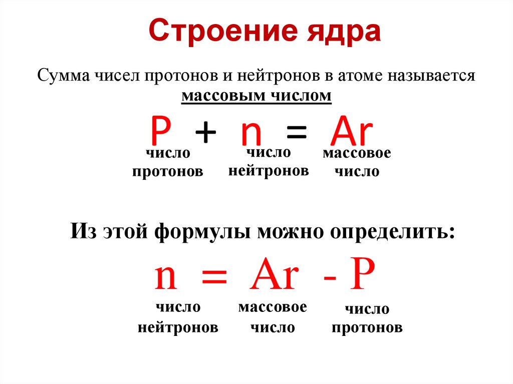Строение ядраСумма чисел протонов и нейтронов в атоме называется