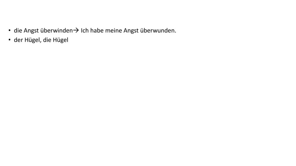 • die Angst überwinden Ich habe meine Angst überwunden.• der Hügel, die Hügel