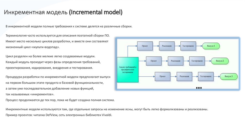Инкрементная модель (Incremental model)В инкрементной модели полные требования к системе делятся на различные сборки.