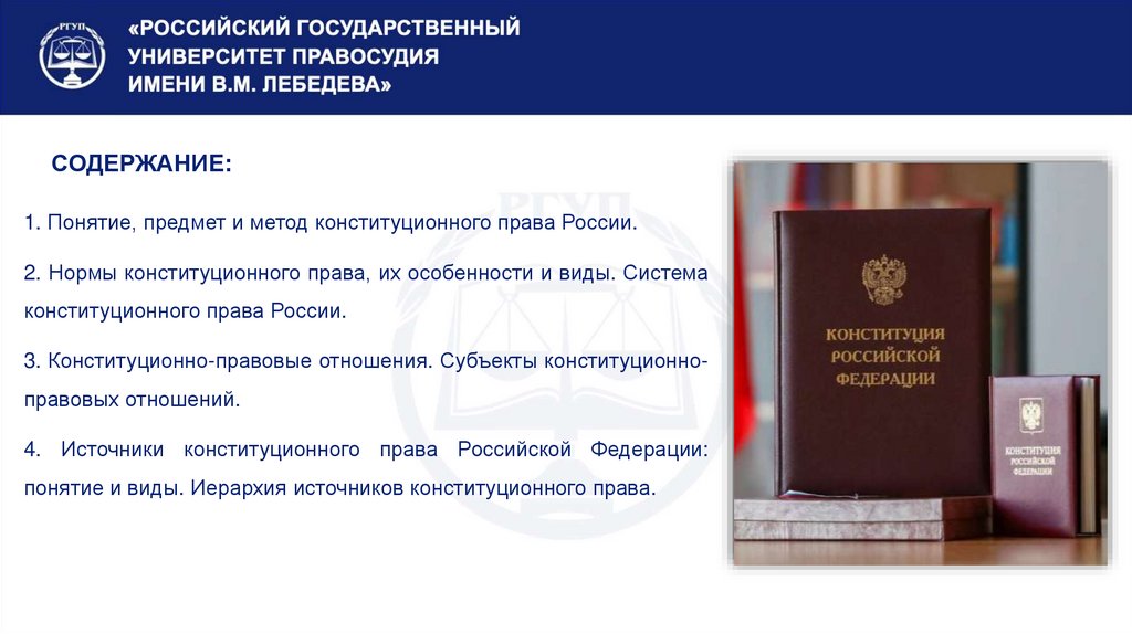 СОДЕРЖАНИЕ:1. Понятие, предмет и метод конституционного права России.