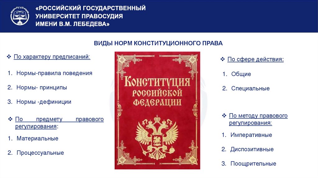 10. ВОПРОС 2. НОРМЫ КОНСТИТУЦИОННОГО ПРАВА, ИХ ОСОБЕННОСТИ И ВИДЫ. СИСТЕМА КОНСТИТУЦИОННОГО ПРАВА РОССИИ.